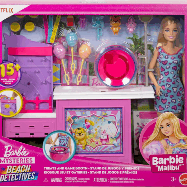 $83.00Beach Detectives Malibu Doll And Cotton Candy Game Booth Playset is a themed playset that combines a doll figure with a colorful game booth for imaginative storytelling and interactive play. Inspired by :contentReference[oaicite:1]{index=1}, it encourages role play scenarios centered around fun booth activities and creative adventures. The set can be arranged on a play surface as a decorative scene, allowing children to style and recreate engaging beach themed moments.