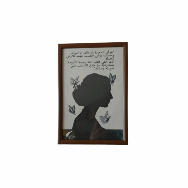 This A4 frame features an elegant illustration of a woman accompanied by an inspiring paragraph celebrating women, titled عرش المحبّة. Perfect for home, office, or creative spaces, it adds a touch of empowerment and style to any wall. Easily framed or displayed on a shelf, it complements modern décor and can be paired with other inspirational prints for a cohesive look.