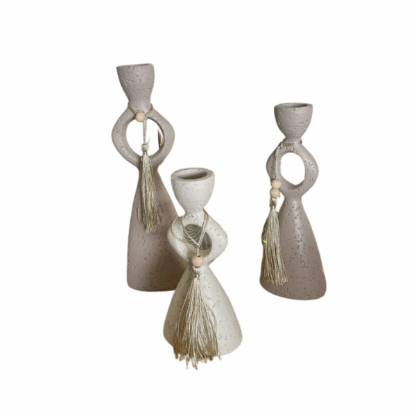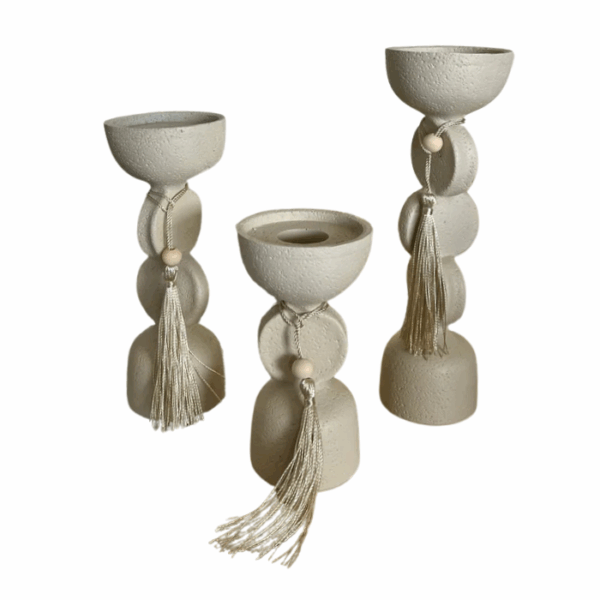$15.00The Stone Greige & Beige Candle Holder Set includes three elegantly crafted holders in varying sizes, featuring a modern design with subtle tassel accents. In neutral greige and beige tones, they provide ambient lighting while seamlessly complementing contemporary décor. Perfect for living rooms, bedrooms, or festive settings, this versatile set enhances any space with style and functionality.