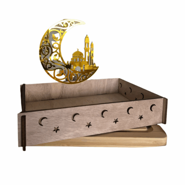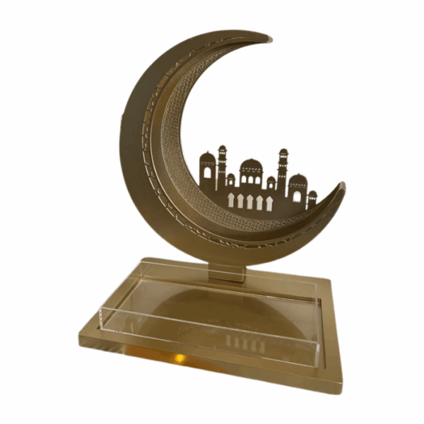 $16.00The Ramadan Wood & Plexi Moon Tray is crafted from durable gold wood and plexiglass, combining aesthetic elegance with practical functionality. Measuring 30×30 cm, it features a beautifully detailed moon design, making it perfect for serving sweets, drinks, or snacks during Ramadan gatherings. This tray also doubles as a decorative piece, adding a festive and sophisticated touch to any setting.