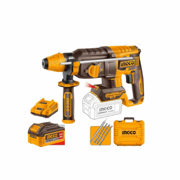 $99.00The INGCO 20V cordless 26mm rotary hammer features a brushless motor, 0 to 1100rpm speed, 0 to 5000bpm impact rate, and 2.5J single impact force for powerful drilling in concrete, steel, and wood. Its SDS plus chuck system, LED work light, and complete kit with drills, chisel, two 4.0Ah batteries, and charger make it ideal for professional and home use. Packed in a durable carrying case for easy transport and storage.