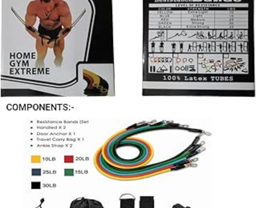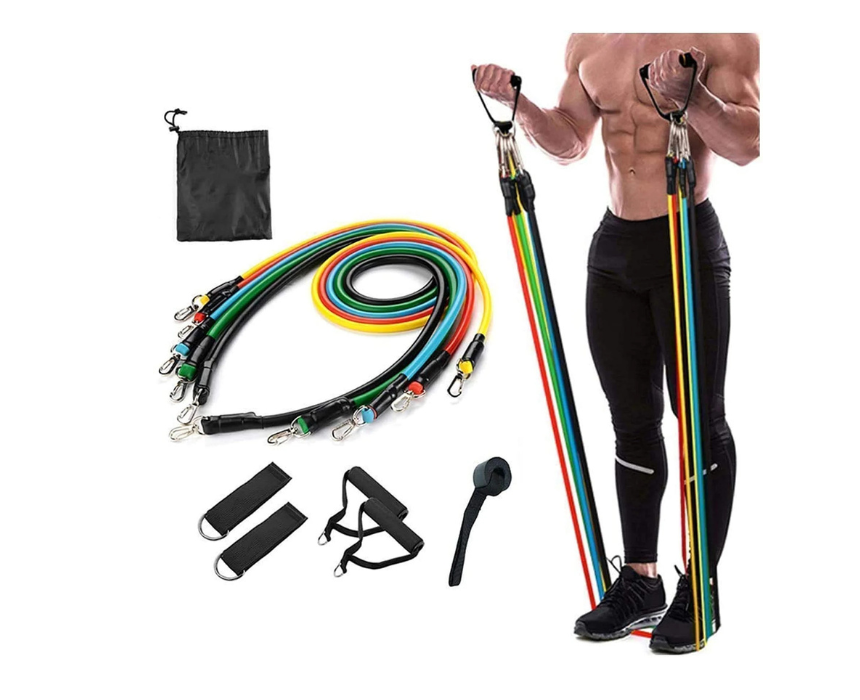 The 11Pcs Resistance Bands Set offers a versatile full-body workout with stackable tension levels, durable latex bands, foam handles, ankle straps, and a door anchor, making it suitable for home, travel, and gym training. It can be worn by securing the bands to the included handles or straps and styled by mixing different resistance levels to match strength or exercise type.