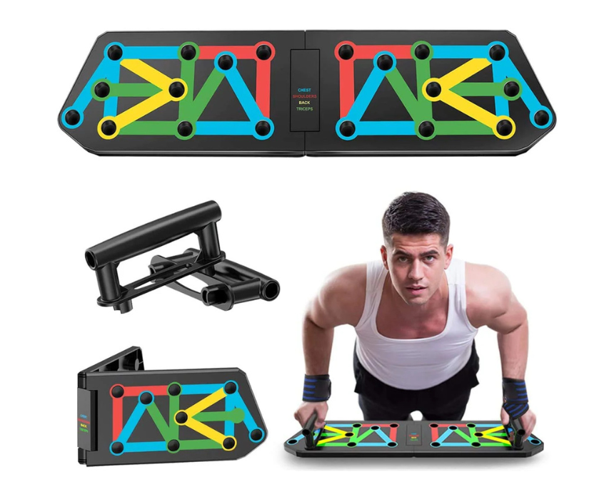 The 12 in 1 Push Up Board System helps users target chest, shoulders, back, and arms with colour-coded positions that guide proper form and enhance strength training. Its foldable, non-slip design makes it easy to use at home or on the go, and it pairs well with gym wear such as breathable tees, shorts, and training gloves for added comfort and stability.