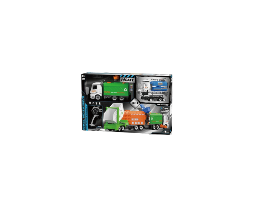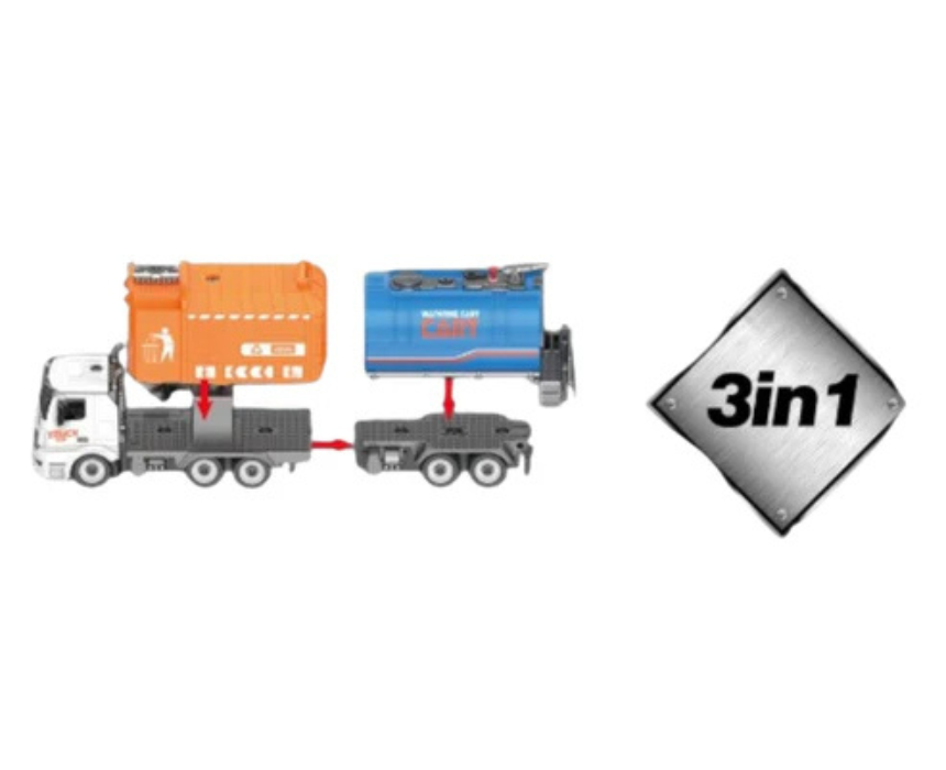 This 3 in 1 DIY sanitation team truck set features a 1:16 scale design that lets kids take apart and rebuild the vehicle using the included tools. The interchangeable parts can be assembled into three different truck configurations, encouraging creativity, problem solving, and hands-on mechanical play. For best play styling, the trucks can be displayed or rebuilt on a flat surface to create realistic work scenes.