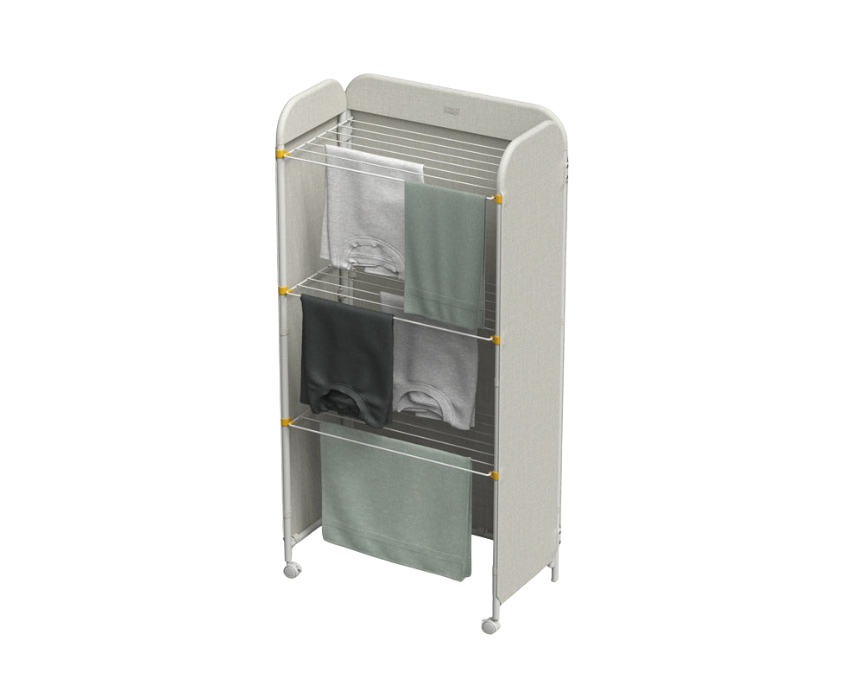 This Joseph Joseph 3-tier indoor clothes airer features a stylish fabric exterior that hides laundry while providing 14 metres of drying space. The heavy-gauge steel tiers can be individually folded to accommodate longer items, and lockable wheels make it easy to move, while the airer folds flat for space-saving storage. Ideal for indoor use, it complements a range of interior styles and requires simple user assembly with easy cleaning for both fabric cover and steel frame.