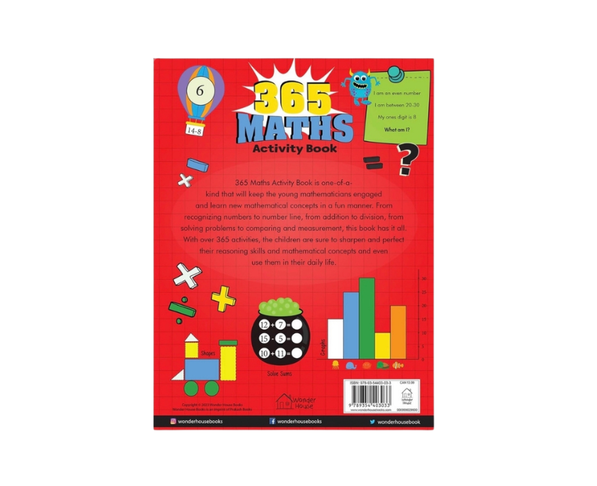 This activity book measures 27.94 by 21.34 cm and is designed to engage young mathematicians in learning math concepts easily. Covering numbers, addition, subtraction, division, problem solving, comparison, and measurement, it offers over 365 activities. Children can refine reasoning skills and apply learned math skills in daily life.