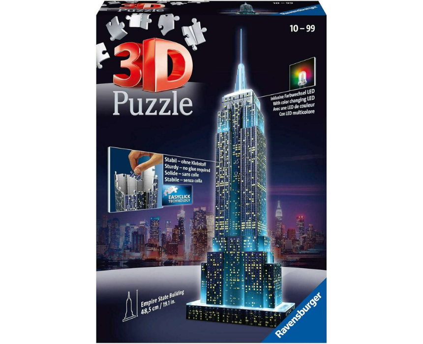 The Ravensburger 3D Empire State Building Night Edition Puzzle lets children and adults create a stunning model of New York’s iconic landmark with integrated LED lighting for a dazzling night display. Using 3D puzzle technology, the model assembles easily without glue, making it both fun and accessible. Perfect as a USA souvenir or gift, it provides an engaging and educational experience for puzzle enthusiasts of all ages.
