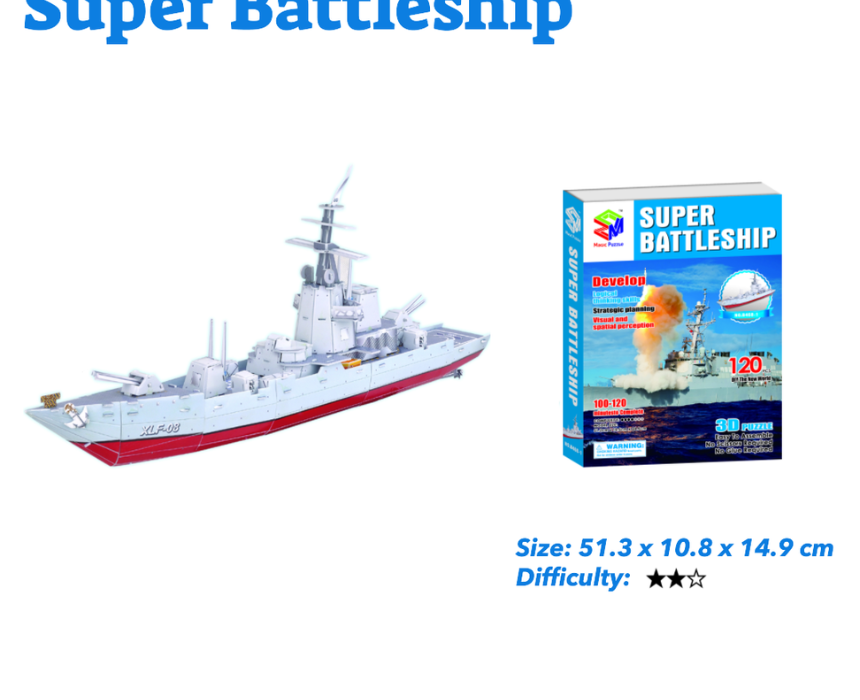 The 3D Puzzle Super Battleship offers an exciting and hands-on building experience, allowing users to assemble a detailed and realistic battleship model. Perfect for display on desks, shelves, or as part of a collection, it combines creativity with educational fun. Ideal for puzzle enthusiasts, hobbyists, and collectors seeking an engaging and decorative project.