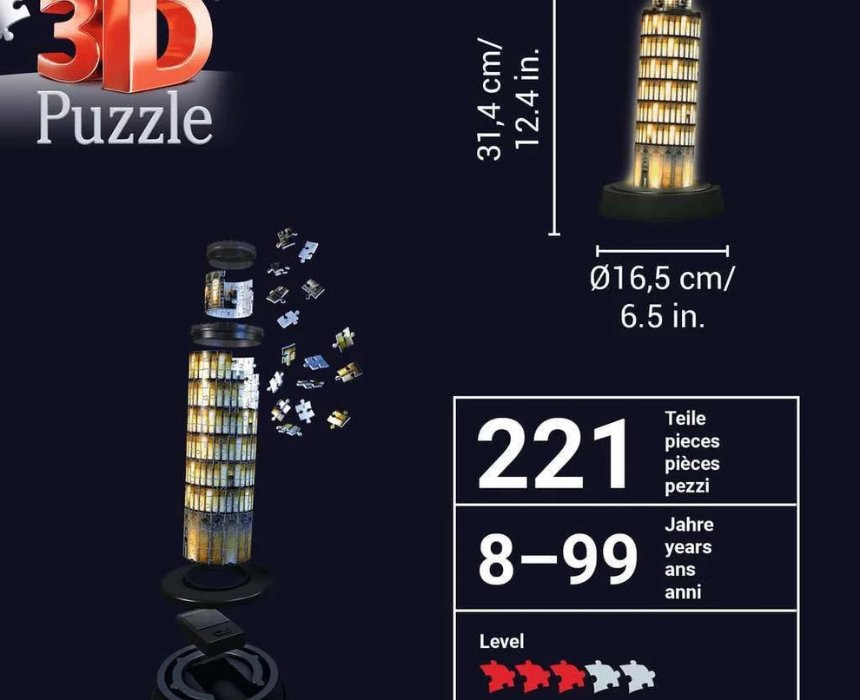 The 3D Puzzle Torre Pendente di Pisa offers a fun and educational building experience as pieces come together to recreate the famous leaning tower in detailed form. Designed to encourage patience, focus, and spatial thinking, it provides an engaging activity for puzzle enthusiasts of different ages. Once completed, the model can be proudly displayed as a decorative piece for a desk, shelf, or room.