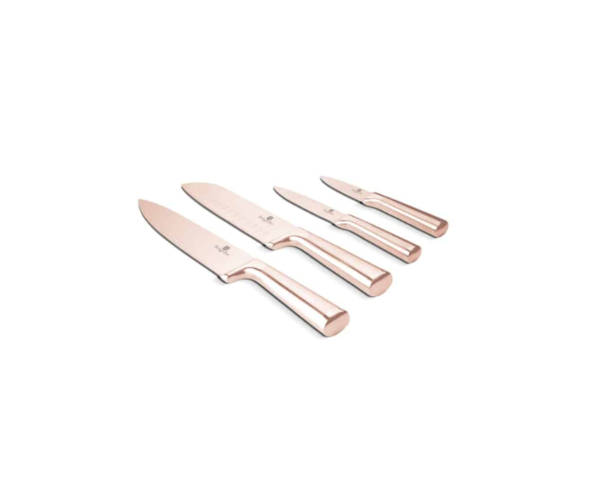 Elevate your culinary skills with the Berlinger Haus Taupe Collection Kitchen Knife Set, featuring premium 3cr13 stainless steel blades, satin and mirror polish handles, and a rose gold finish. The set includes a 20 cm chef knife, 17.5 cm Santoku knife, 12.5 cm utility knife, and 9 cm paring knife, all sharpened by hand and stored in a magnetic gift box for elegance and safety. Perfect for chopping, slicing, and dicing while adding style to any kitchen.