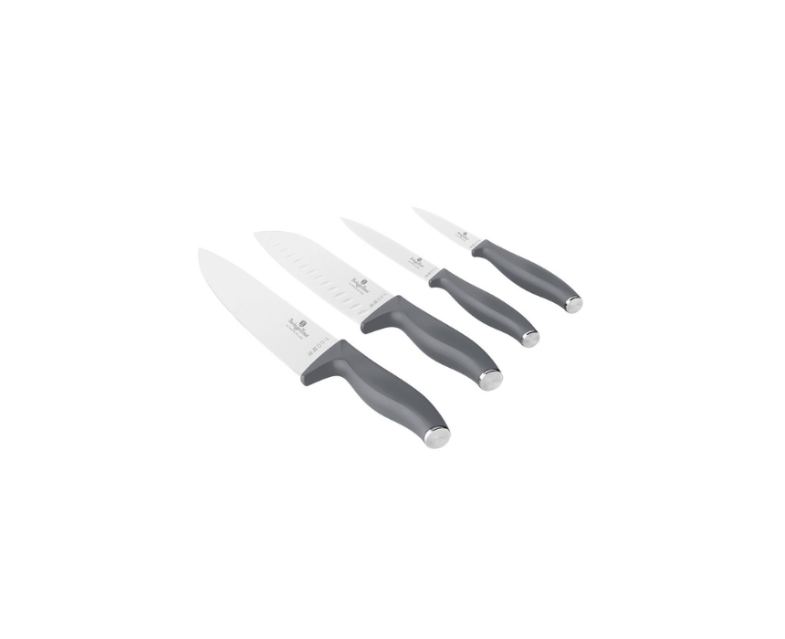 The Berlinger Haus BH2955 Aspen 4-Piece Knife Set combines elegance and functionality with high-quality 3cr13 stainless steel blades and a matte grey finish. Hand-sharpened, heat-treated, and designed with ergonomic soft-touch handles and integrated finger guards, these knives offer precision, comfort, and safety for all kitchen tasks. The set includes a 20 cm chef knife, 17.5 cm santoku knife, 12.5 cm utility knife, and 9 cm paring knife, perfect for chopping, slicing, dicing, and peeling.