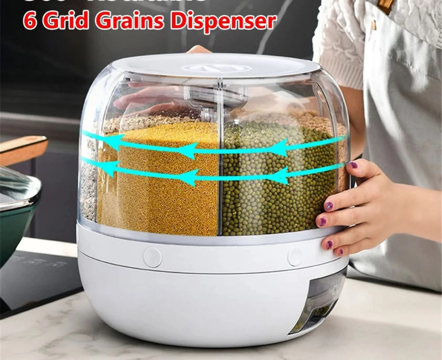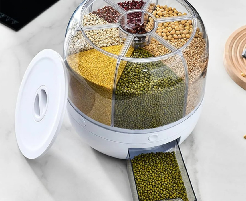 The 6 compartments grains kitchen dispenser offers organized storage for rice, lentils, cereals, and other dry goods with easy-to-use pour spouts and a clear design for quick identification. Its compact, multi-compartment layout keeps countertops tidy and ingredients accessible; simply fill each section and dispense as needed for efficient cooking and meal prep.