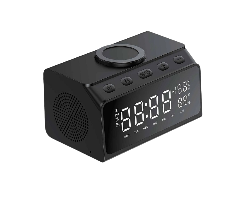 The W3041 6 in 1 phone wireless charger with clock in black combines wireless charging with a built in digital clock for a smart all in one solution. Designed for desks or bedside tables, it keeps devices powered while adding a sleek, modern touch to workspaces or bedrooms. Its compact upright style helps keep areas organized and clutter free.