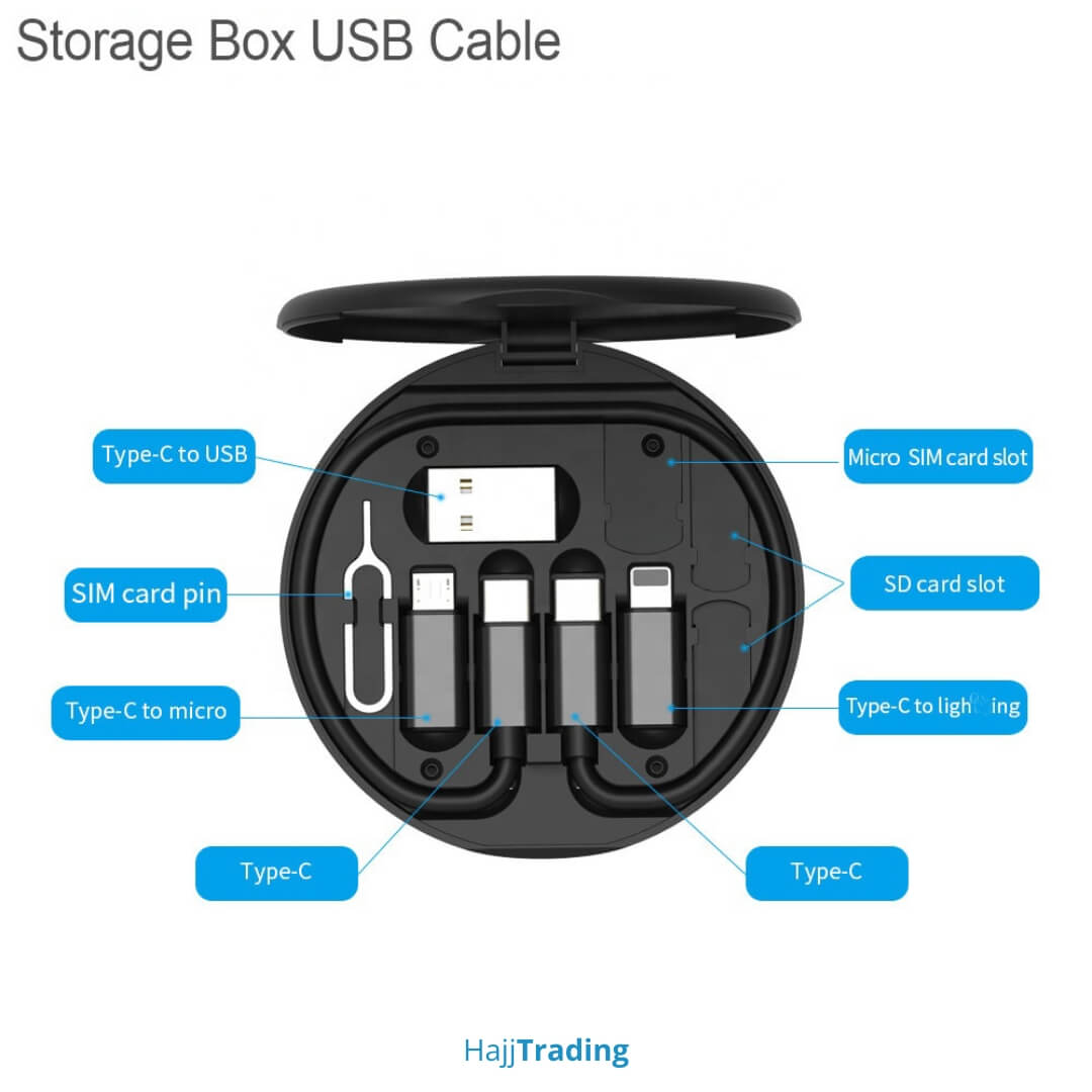 Stay connected on the go with this compact 6-in-1 Tech Gadget Storage Box. This portable kit includes a Type-C to Type-C data cable, plus converters for Lightning, Micro-USB, and USB. It features a built-in SIM toolkit with two SIM slots, a memory card slot, and an eject pin. The rugged case also transforms into a convenient phone stand for hands-free viewing. Perfect for travel, it fits easily in any pocket or bag. Sleek and multifunctional design.