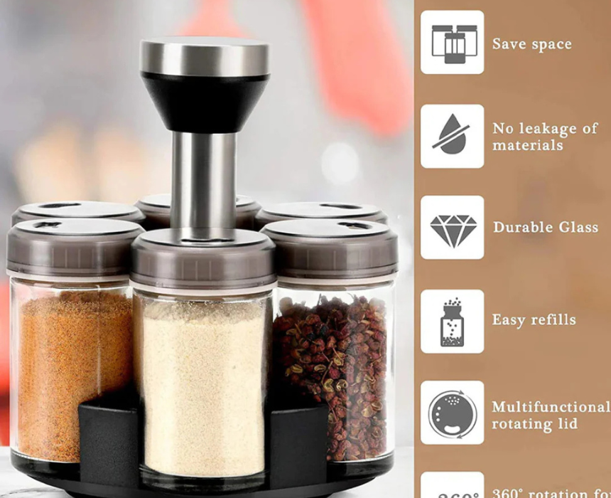The 6 jar spice rack organizer keeps essential seasonings neatly arranged with clear, refillable jars and a compact stand that fits easily on countertops or inside cabinets. Its practical design helps maintain an organized kitchen; simply fill the jars with favorite spices and place the rack within reach for effortless cooking.