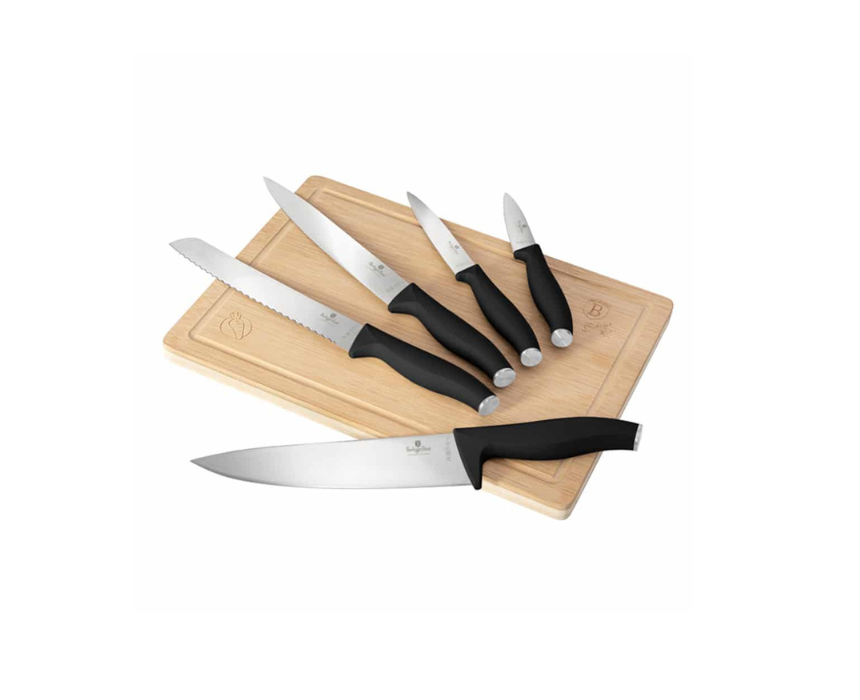 Master every kitchen task with the Berlinger Haus BH2964 6-Piece Knife Set, featuring hand-sharpened, heat-treated 3cr13 stainless steel blades and ergonomic soft-touch handles. This set includes a 20 cm chef knife, 20 cm slicer, 20 cm bread knife, 12.5 cm utility knife, 9 cm paring knife, and a bamboo cutting board, combining precision, safety, and modern elegance for effortless chopping, slicing, and detailed prep in any home kitchen.
