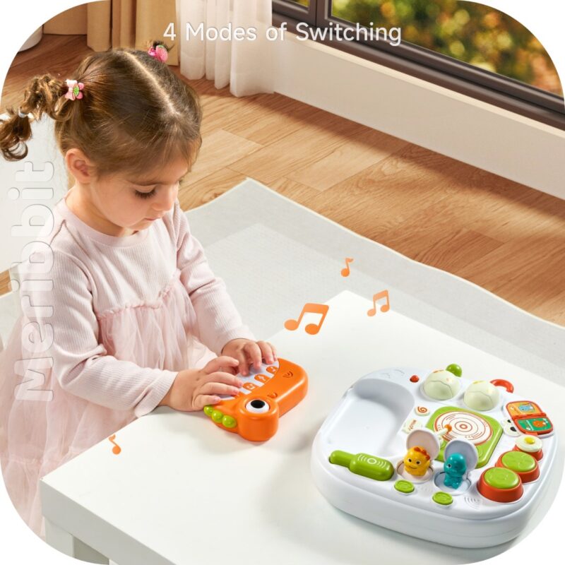 This 7-in-1 dinosaur-themed play table offers multiple interactive modes including an electronic piano, sound buttons, tambourine, flip book, dinosaur hide-and-seek, and more, with music and colorful lights to boost creativity and color recognition. Made from safe, eco-friendly materials with smooth edges, it encourages motor skills, focus, and imaginative play. Removable legs allow babies to play sitting or standing for flexible use. Recommended age: 12+ months.