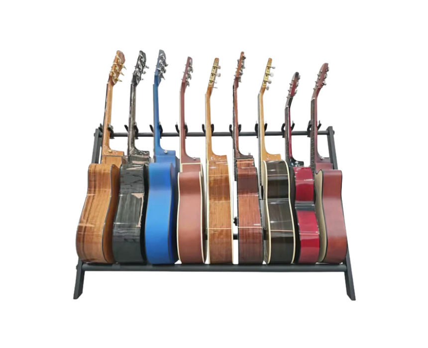 This 9-slot guitar rack provides organized, secure storage for multiple guitars, keeping them easily accessible while protecting them from damage. Its sturdy design makes it suitable for home, studio, or rehearsal spaces.