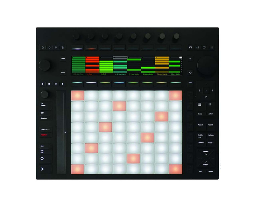 This professional MIDI controller features 64 velocity sensitive RGB pads with polyphonic aftertouch for expressive performance and beat making. It includes a high resolution display for visual feedback, plus dedicated knobs and a touchstrip for hands on control of instruments, mixing, and arrangement. USB C, MIDI I O, and pedal inputs provide flexible connectivity, while deep integration with Ableton Live supports an advanced production workflow.