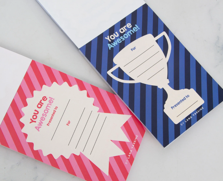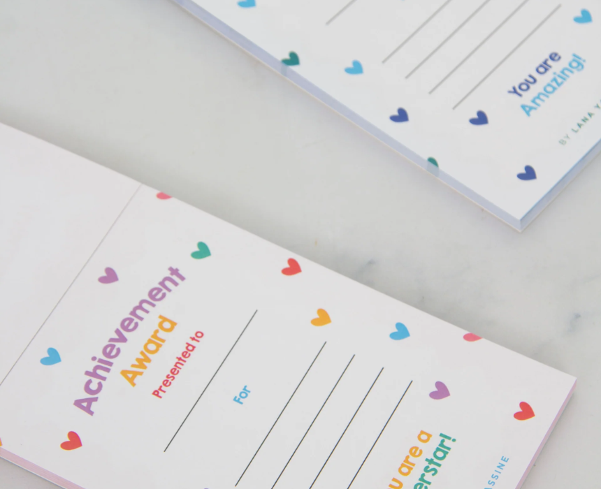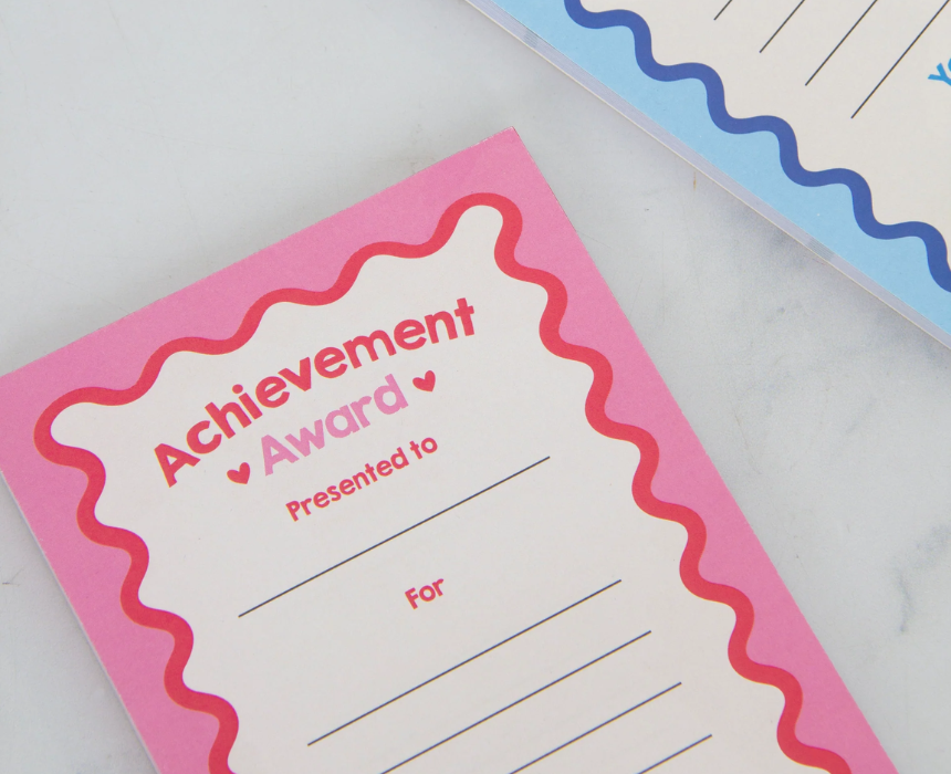 The Achievement Award Pads feature fifty tear-off sheets in a portable A6 size designed to make daily encouragement easy for parents and teachers. Each pack includes four vibrant repetitive designs with dedicated space to write a name and a personalized message of praise for small victories. To style these awards, pin them to a colorful bedroom bulletin board or tuck them into a lunchbox as a delightful midday surprise that celebrates a childs hard work and positive behavior.
