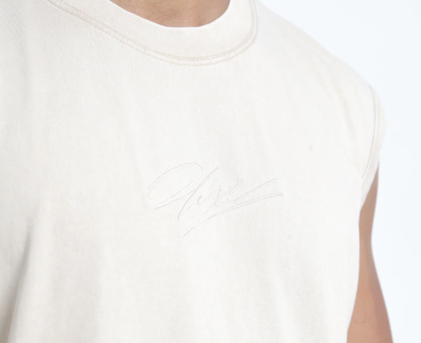 This acid washed men’s off white tank top is made from 100% organic cotton and finished with a signature vintage wash for a worn-in streetwear look. The front features an embroidered DOUBLEXXCOLLECTION signature that adds a subtle yet iconic brand detail. Style it with denim, neutral trousers, or layered under an open shirt or jacket for a clean, modern streetwear outfit.