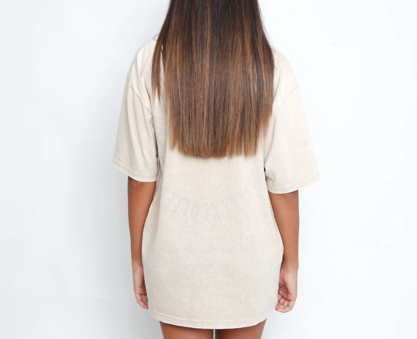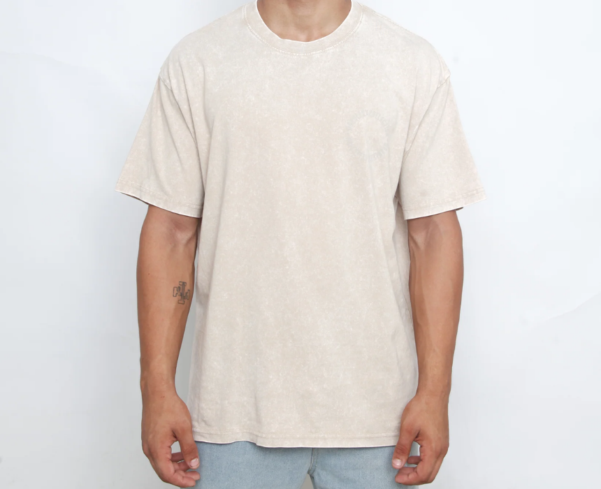 This acid washed unisex off white T-shirt is crafted from 100% organic cotton and designed with an oversized vintage wash fit for all-gender wear. It features a subtle circular DOUBLEXXCOLLECTION logo on the front left chest and a bold oversized logo on the back with a short collection paragraph printed beneath. Style it with denim, tailored pants, or layered with outerwear for a clean, elevated streetwear look.
