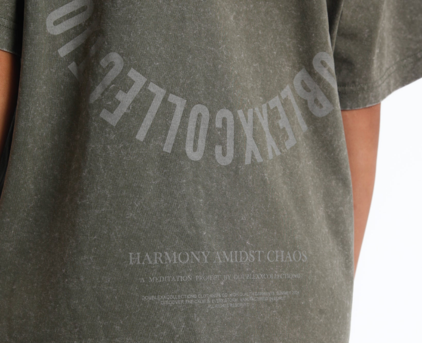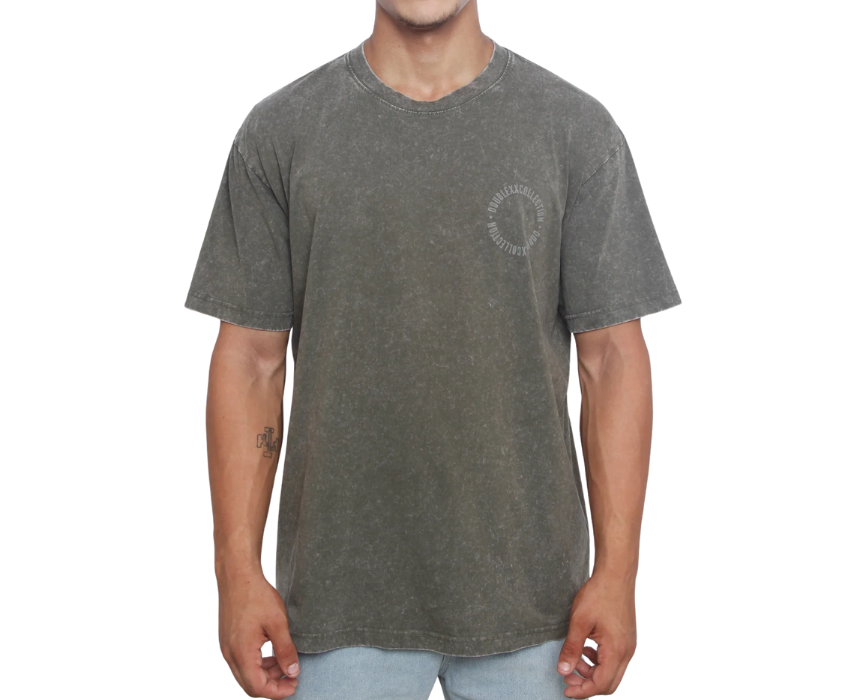 This acid washed unisex olive green T-shirt is made from 100% organic cotton and features an oversized vintage wash fit in S–M and L–XL for all-gender wear. The front displays a subtle circular DOUBLEXXCOLLECTION logo on the left chest, while the back showcases an oversized logo centered above a short collection paragraph. Style it with neutral cargos, denim, or layered with a jacket for an elevated streetwear look.