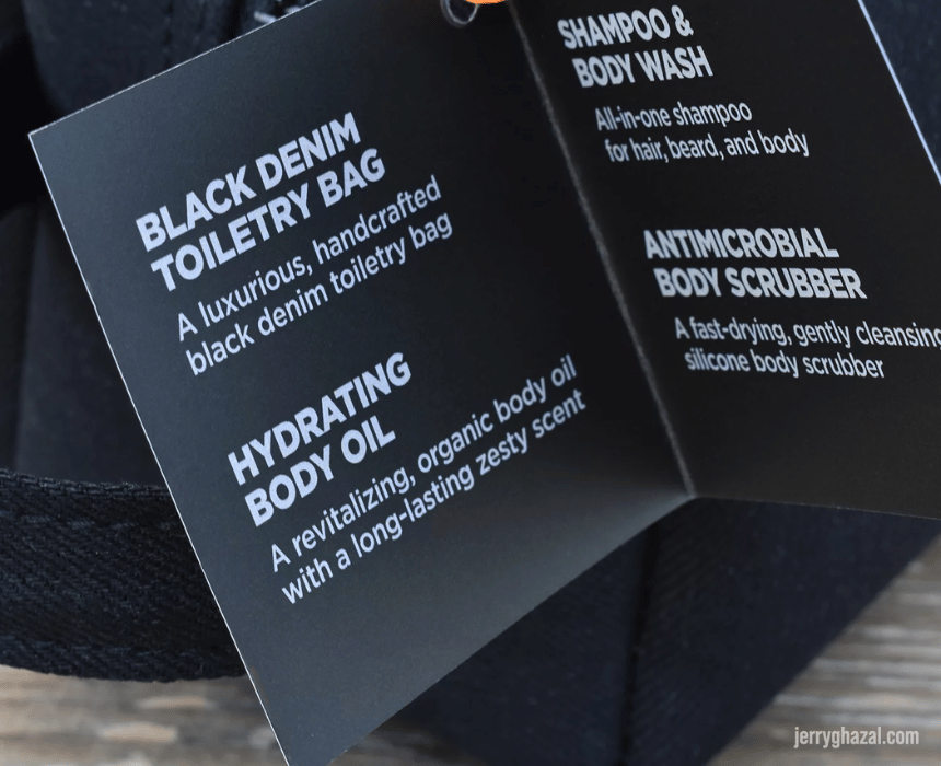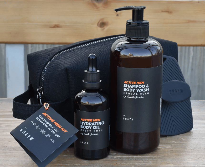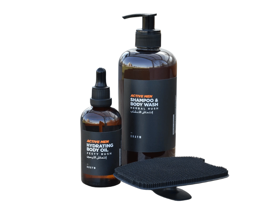 The Active Men Kit is a premium grooming set featuring a handcrafted black denim toiletry bag, 100 ml Organic Zesty Rush hydrating body oil, 500 ml Organic Herbal Rush all-in-one shampoo, and a fast-drying antimicrobial silicone body scrubber. Packaged with an elegant black gift bag, it’s perfect for daily care or gifting.