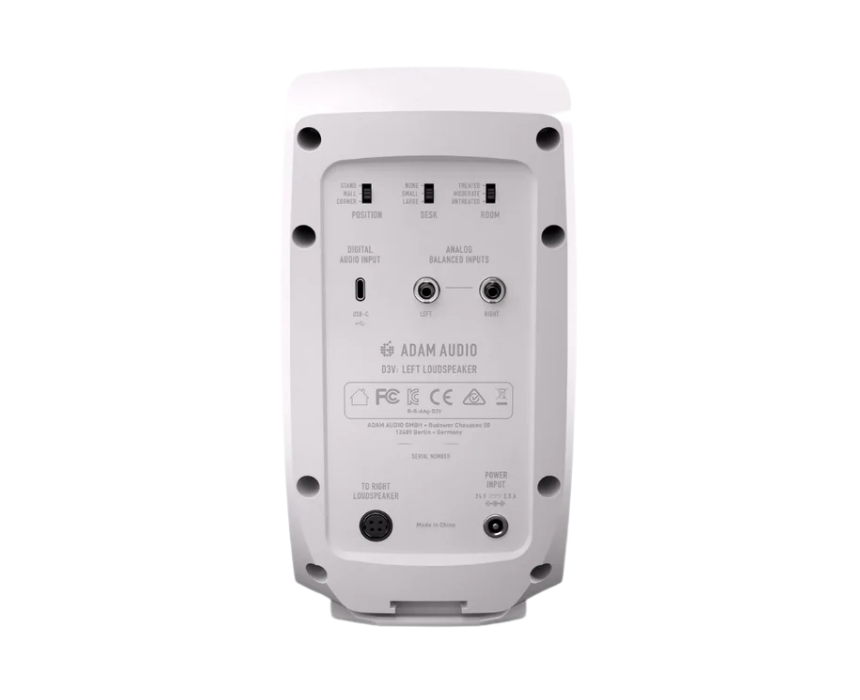 The ADAM Audio D3V Desktop Monitors in white are compact, active speakers designed for precise, professional-grade audio. Each monitor features a 3.5-inch aluminum woofer, dual passive radiators, and a 1.5-inch D-ART tweeter, delivering clear highs, rich mids, and controlled bass. With USB-C and balanced TRS inputs, DSP room adaptation controls, and versatile mounting options, they are perfect for home studios, content creation, and detailed music listening.