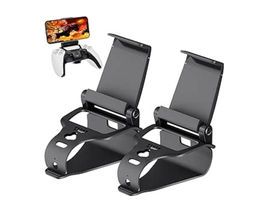 This controller phone mount securely attaches a smartphone to a PS5 DualSense controller for comfortable remote play gaming. It is adjustable to fit iPhone and Android devices, allowing clear screen viewing and stable positioning during gameplay. Ideal for mobile gaming sessions, it enhances control and comfort while playing on the go.