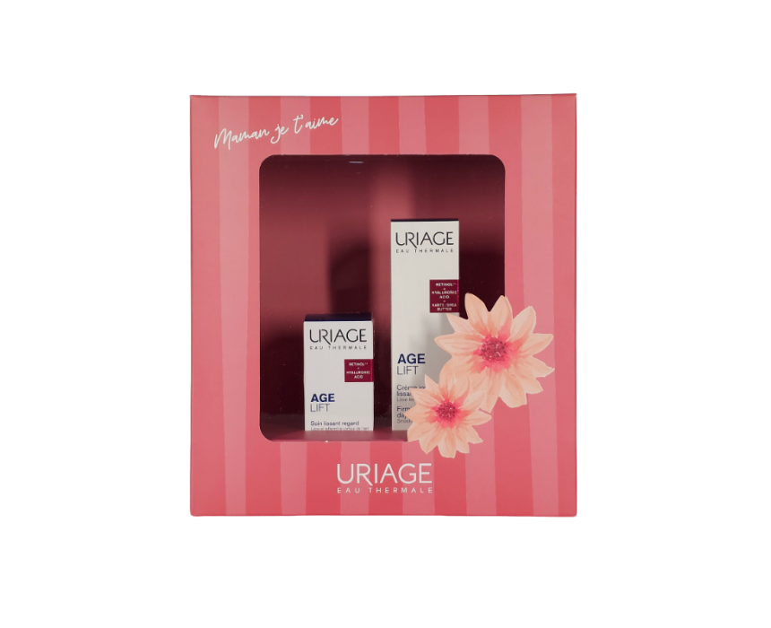 The Uriage Age Lift Coffret is an anti-aging set featuring a firming day cream and eye contour care to smooth wrinkles and revitalize mature skin. The day cream hydrates, firms, and protects, while the eye care reduces fine lines and puffiness for refreshed eyes. Enriched with Uriage thermal water, both formulas strengthen the skin barrier and promote a radiant, firmer complexion with daily use.