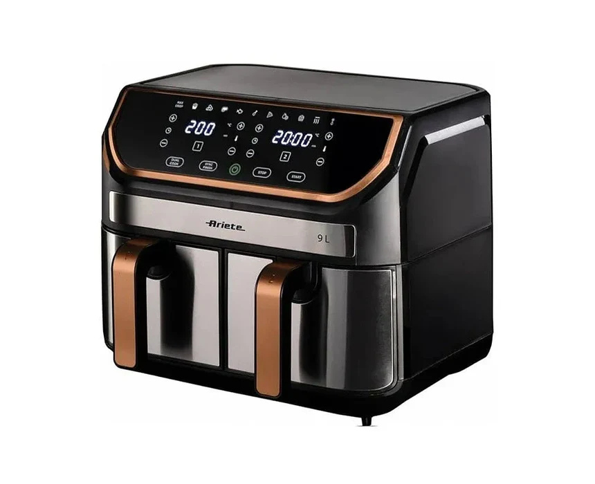 The Ariete Dual Air Fryer 9L in Stainless Steel and Pink Gold cooks large quantities of food using just one tablespoon of oil, delivering healthier, crispy results. Featuring two 4.5L baskets, 2100W power, 11 preset programs, and Max Crisp technology, it allows simultaneous cooking of different dishes or large portions. Perfect for fries, fish, meat, and breaded foods, it combines convenience, speed, and easy cleaning for family meals.