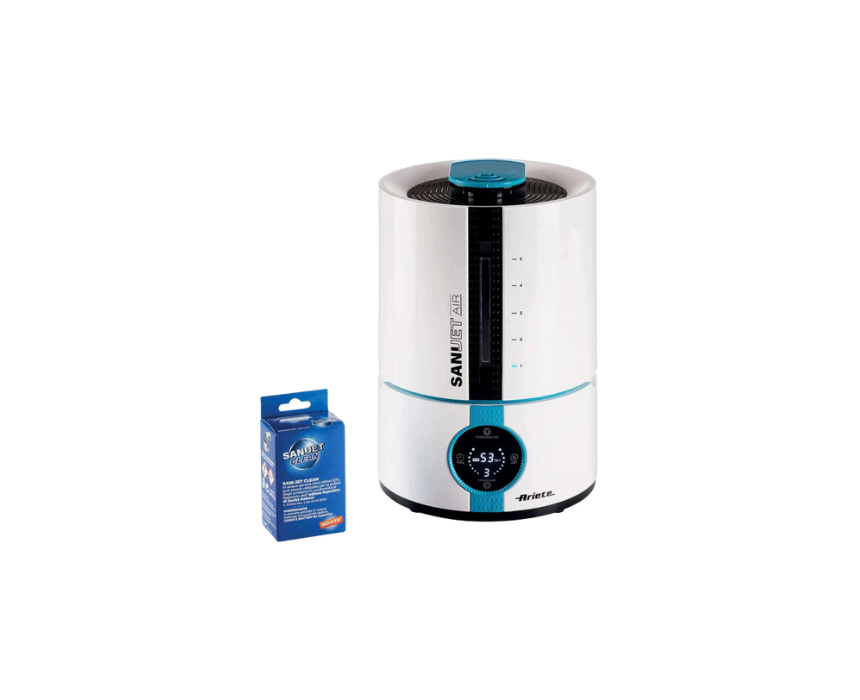 The Sani-Jet Air Ultrasonic Sanitizer and Humidifier cleans and refreshes indoor environments up to 90 m² using Sani-Jet Clean solution in full autonomy. With a 5L tank, LED touchscreen, ionic function, adjustable timer, and three intensity levels, it sanitizes, humidifies, and eliminates germs from hard-to-reach areas. Ideal for homes, offices, gyms, salons, and kindergartens, it ensures healthier, safer, and more comfortable air effortlessly.