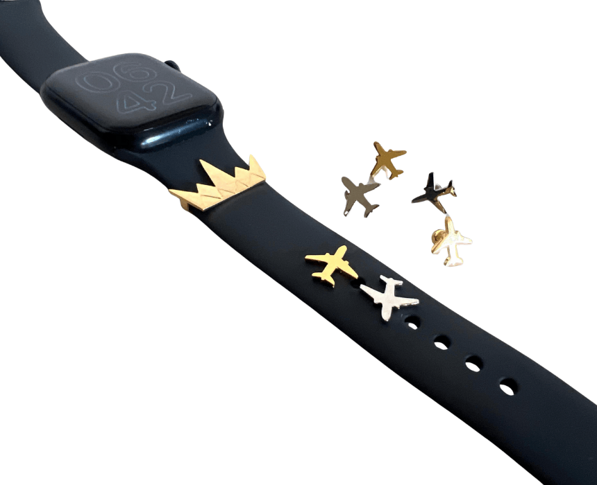 Airplane Smartwatch Pin from the Lebanon Memorabilia collection is a gold-plated accessory designed to decorate Apple and Samsung watch bands. Perfect for travel lovers or those celebrating a connection to Lebanon.