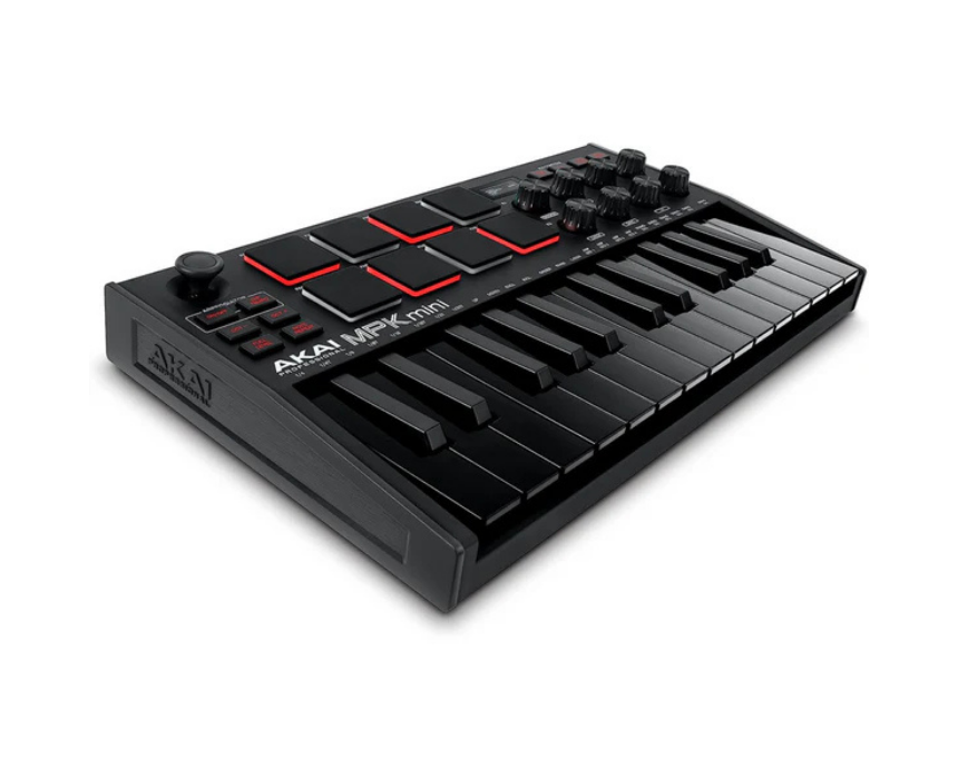 The Akai MPK Mini MKIII Limited Edition Black is a 25-key MIDI controller with synth-action mini keys, 4-way thumbstick, 8 MPC-style pads, and 8 control knobs. Compact and versatile, it’s ideal for music production, beat making, and home studio setups.