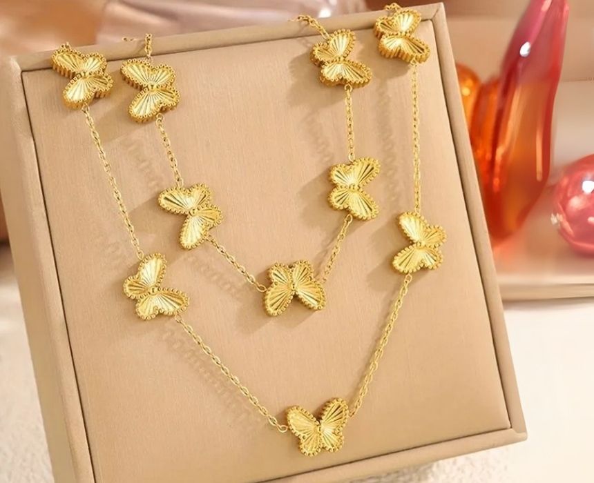 The Alhambra Butterfly Set features a delicate necklace and bracelet, each crafted from shiny, durable stainless steel and sold separately. Perfect for adding a subtle touch of elegance, these pieces can be worn alone for a minimalist look or layered together for a charming, coordinated style. Ideal for everyday wear or special occasions, they effortlessly complement both casual and formal outfits.