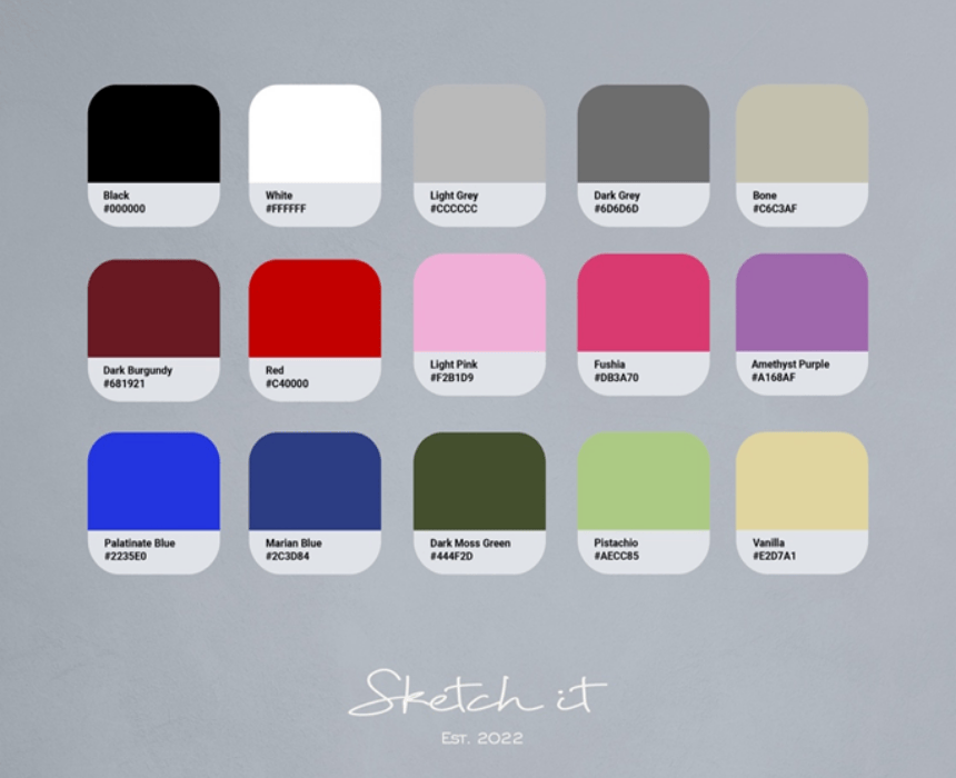 Dark Moss Green ,Marian Blue ,Palatinate Blue ,Pistachio ,Vanilla ,Red ,Amethyst ,Black ,Bone ,Burgundy ,Dark Grey ,Fushia ,Grey ,Light Grey ,Light Pink ,White |