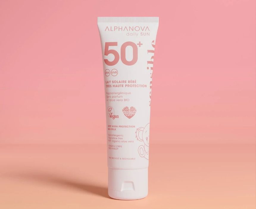 Alphanova Baby Sun Milk SPF 50+ (50 ml) is specially designed for newborns and toddlers with sensitive skin, offering very high UVA and UVB protection using 74% natural and 40% organic ingredients. Fragrance-free, hypoallergenic, and water and sand resistant, it applies easily with a non-greasy texture and stays effective even after swimming or playing. Enriched with organic aloe vera and eco-friendly filters, it keeps baby skin hydrated and protected all day long.