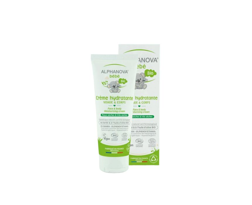 Alphanova Face and Body Moisturizing Cream 75 ml is a gentle vegan formula designed for the dry and sensitive skin of babies and infants. Enriched with organic olive oil, shea butter and cotton, it hydrates deeply, reduces redness and tightness, and leaves the skin soft, supple and protected without feeling sticky. Dermatologically tested and hypoallergenic, it is perfect for daily use on both face and body.