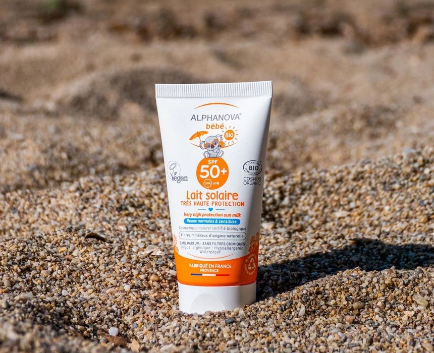 Alphanova Organic Baby Sun Milk SPF 50+ (50 g) offers high protection for babies’ face and sensitive areas using mineral filters only. Fragrance free, alcohol free, and hypoallergenic, it’s gentle on fragile skin and eco conscious, safe even for use in water. Lightweight and non greasy, it’s perfect under sun hats and baby beachwear, reapply after swimming for full UV defense.