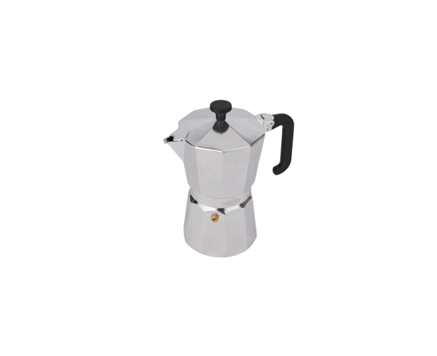 The La Cafetière Venice 6-cup aluminium espresso maker delivers classic stovetop coffee brewing with fast, efficient heat conduction and a 290ml capacity, suitable for gas, ceramic, and traditional hobs. Finished in silver aluminium with heat-resistant plastic handle and knob, it is easy to clean, simple to use, and ideal for social occasions, measuring 17 x 10.5 x 19 cm and backed by a 10-year guarantee. To use, fill the base with water, add ground coffee to the filter basket, and place it on the hob for a timeless espresso experience.