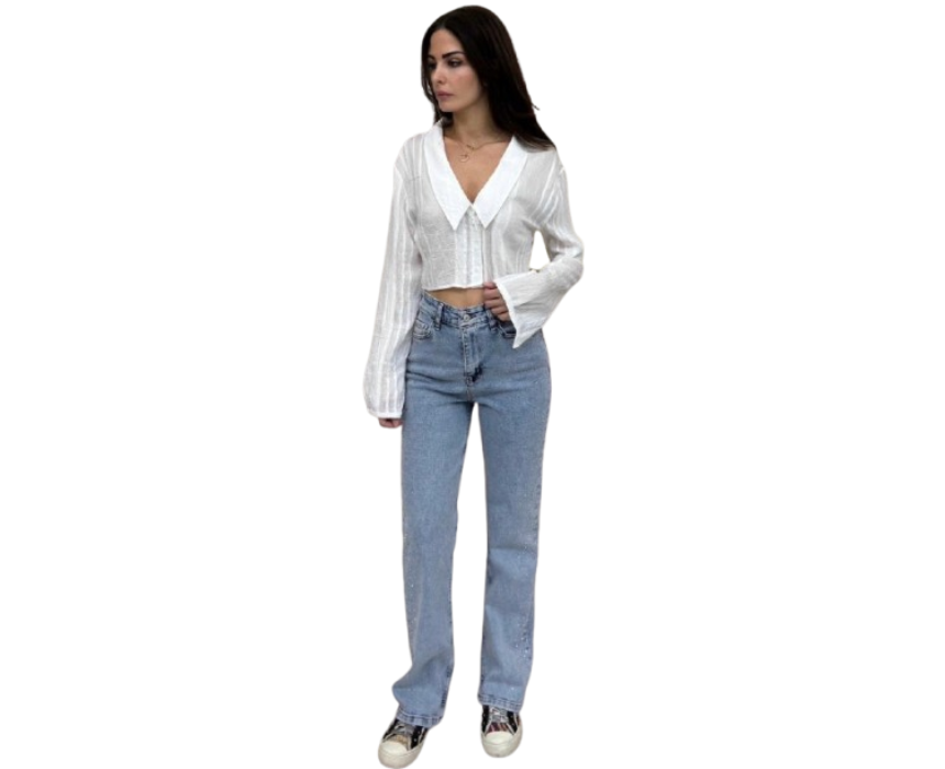 This women’s shirt features a lightweight textured fabric with a subtle sheen that creates a refined yet relaxed silhouette. Designed with a cropped cut and softly flared sleeves, it offers breathable comfort and modern style. Pair it with high waisted jeans or tailored bottoms for an effortlessly chic look.