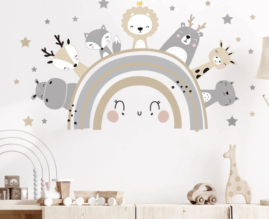 The Animals on Rainbow Wall Sticker features playful animal designs on a colorful rainbow, adding charm and cheer to any room. Available in grey and beige tones, it’s perfect for kids’ rooms or nurseries, creating a cozy and whimsical atmosphere. Easy to apply and remove, this sticker brings a fun and decorative touch to walls.