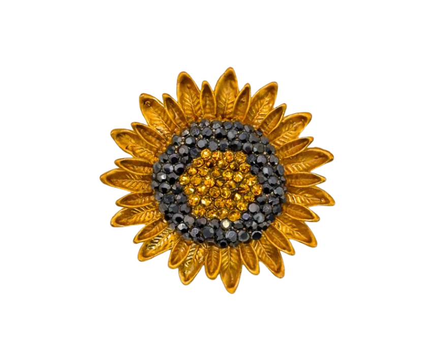 This brooch features an antique gold sunflower design with a paved crystal center, creating a warm and radiant accessory with a refined vintage inspired look. Crafted with detailed petals and sparkling accents, it can be styled on jackets, blazers, scarves, hats, or bags to add a cheerful statement and enhance both casual and dressy outfits with subtle brilliance.