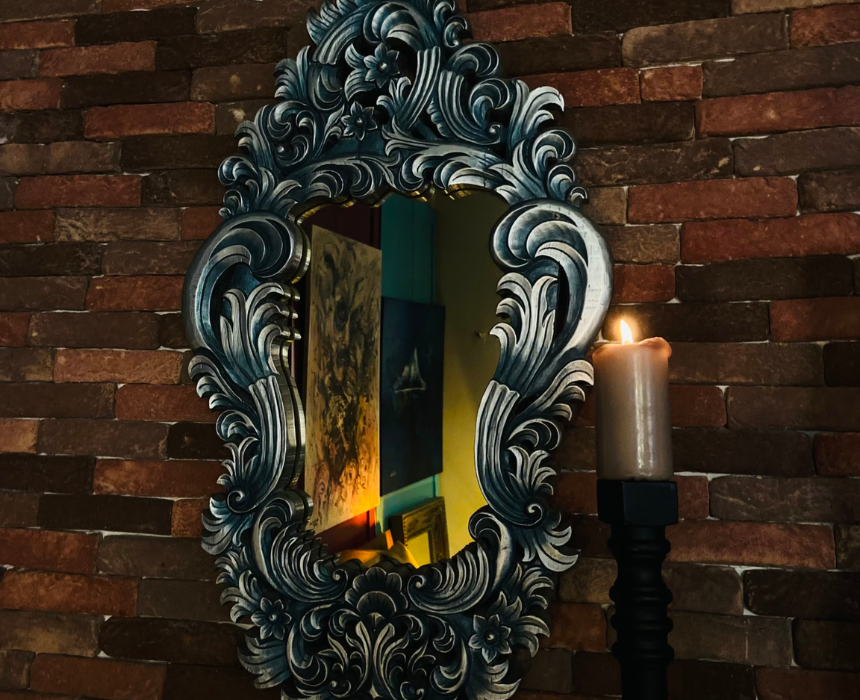 Add timeless elegance to your home with this antique Venetian-style mirror, featuring a distinctive escutcheon shape. The frame is beautifully decorated with Baroque-inspired flowers and scrolls, finished in silver leaf with blue patina, and complemented by a dark mirrored glass that adds depth and character. Perfect as a statement piece for a hallway, living room, or bedroom, this mirror combines classical artistry with antique charm.