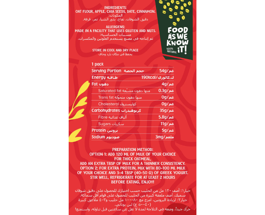 Apple Cinnamon Chia Oatmeal Mix offers a warm and naturally sweet blend of oat flour, real apple, chia seeds, dates and cinnamon, creating a fiber-rich and wholesome breakfast that’s quick to prepare. It can be enjoyed thick or creamy with milk, boosted with Greek yogurt for extra protein, and styled with sautéed apples, nut butter, raisins or walnuts for a cozy and satisfying meal anytime.