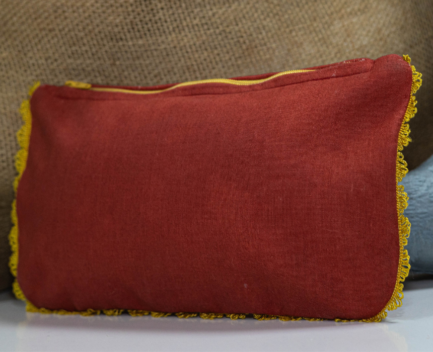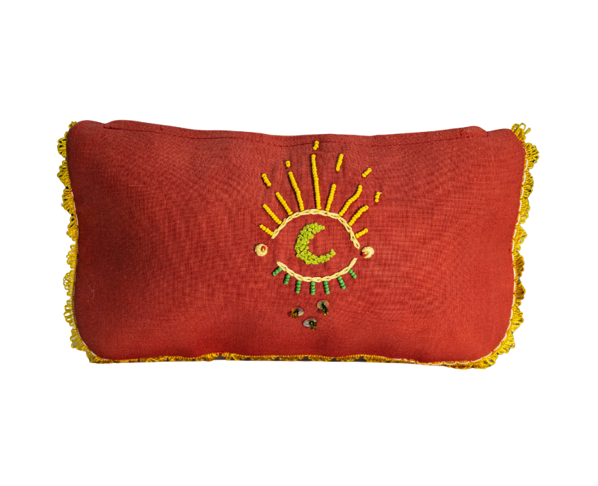 <p>This elegant small pouch is crafted from brick red fabric and features handmade eye and moon shaped bead embroidery. It includes a refined lining, high end finishing, and a decorative yellow trim along the border, making it a stylish and unique accessory for everyday use or special occasions.</p>