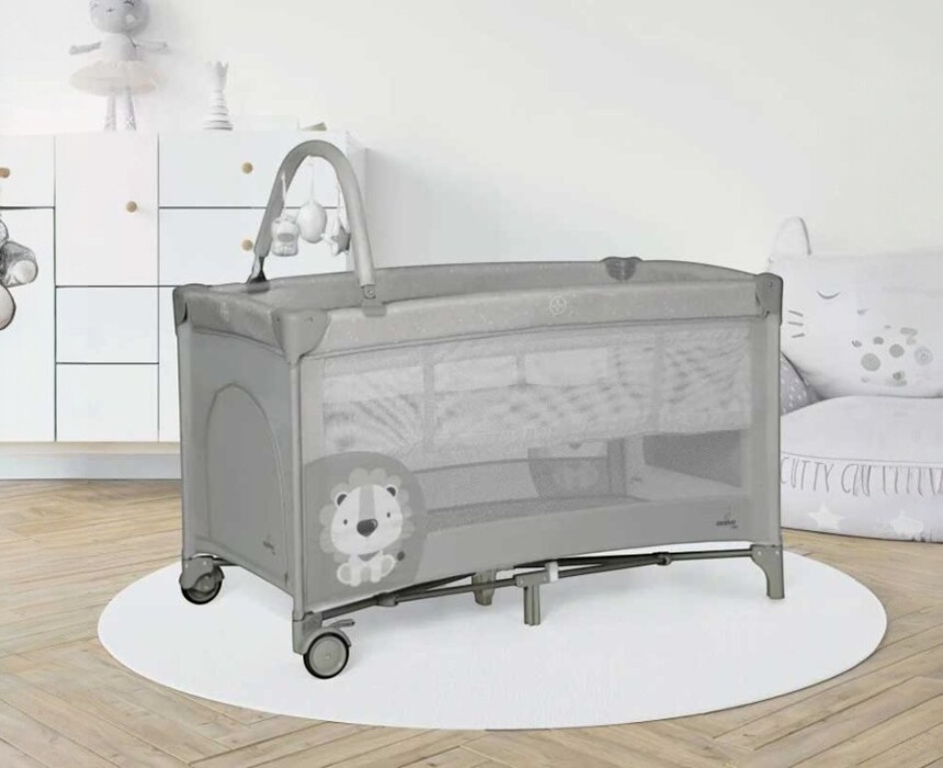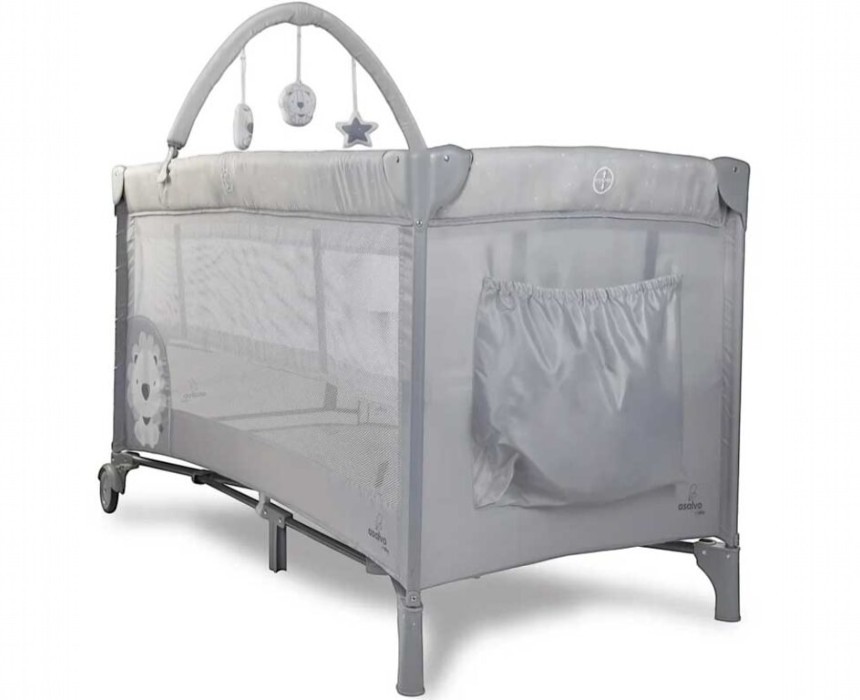 The Asalvo Complet Duo Playpen in Lion Grey is a versatile solution for home or travel. This practical baby bed features a removable second layer for infants, two wheels with brakes, and a zippered entrance for older children. The mesh sides provide ventilation and visibility, while the included toy mobile keeps baby entertained. Folds compactly into a transport bag and meets EU safety standards.