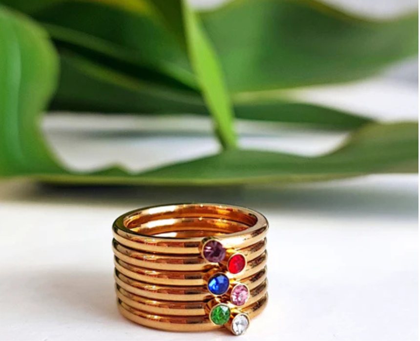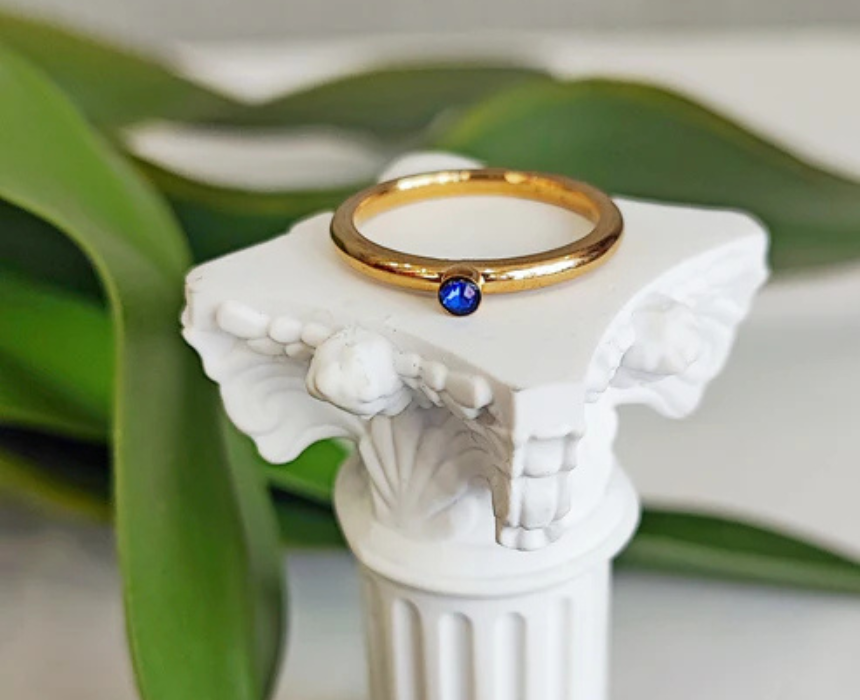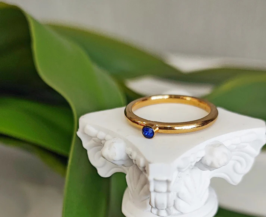 The Aurora in Blue Ring is crafted from 18K Gold Plated Stainless Steel and features a striking blue design with water-resistant durability, perfect for adding a pop of color and elegance to any outfit, can be worn alone for a statement look or stacked with other rings for a layered effect, ideal for casual or formal occasions.