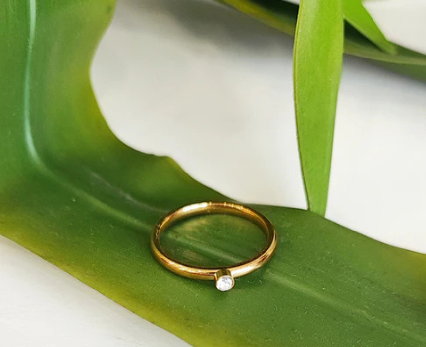 The Aurora in White Ring is crafted from 18K Gold Plated Stainless Steel and features a sleek white design with water-resistant durability, perfect for adding a subtle yet elegant touch to any outfit, can be worn alone as a statement piece or stacked with other rings for a layered look, ideal for casual or formal occasions.